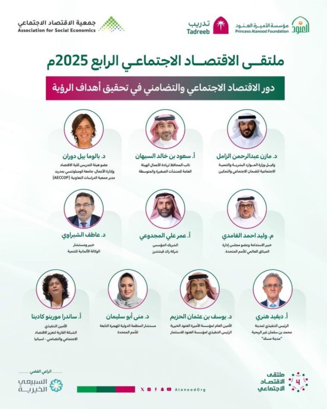 تنظم مؤسسة الأميرة العنود الخيرية بالشراكة مع جمعية الاقتصاد الاجتماعي، يوم غد الأربعاء الموافق 1 أكتوبر 2025، فعاليات ملتقى الاقتصاد الاجتماعي الرابع، بمشاركة واسعة من الخبراء والقيادات في القطاع الحكومي والقطاع الخاص والقطاع غير الربحي، وذلك في تمام الساعة التاسعة صباحًا.