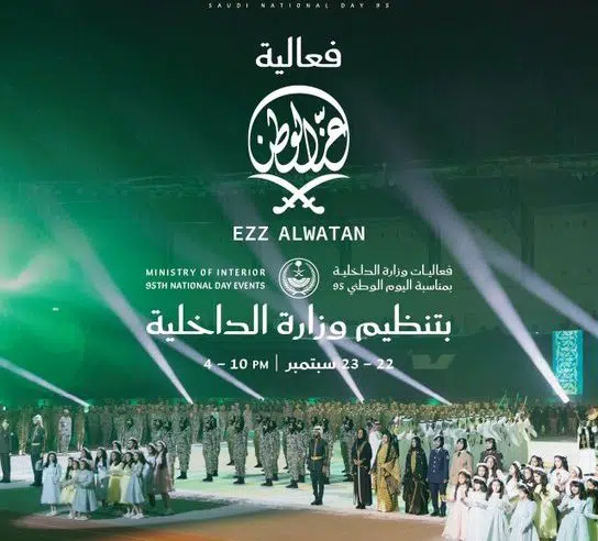 تقيم وزارة الداخلية، بالشراكة مع الهيئة العامة للترفيه، فعالية “عز الوطن” احتفاءً باليوم الوطني الخامس والتسعين للمملكة، وذلك من 22 إلى 23 سبتمبر 2025م، في منطقة بنبان بمدينة الرياض، من الساعة الرابعة مساءً حتى الحادية عشرة ليلًا.