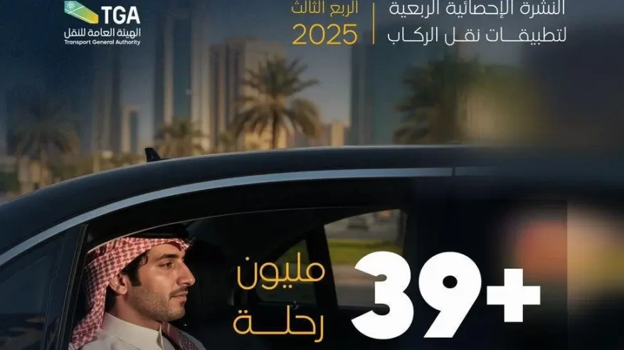 كشفت الهيئة العامة للنقل، اليوم، أن عدد الرحلات المنفذة عبر تطبيقات نقل الركاب في المملكة حققت ارتفاعًا ملحوظًا خلال الربع الثالث من عام 2025م، بعد أن سجلت أكثر من 39.04 مليون رحلة، بارتفاع بلغ 78 % مقارنة بالربع المماثل من عام 2024م.