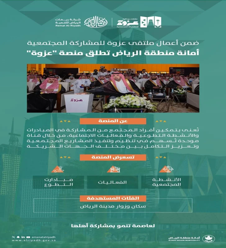دشّن صاحب السمو الأمير الدكتور فيصل بن عبدالعزيز بن عيّاف، أمين منطقة الرياض، منصة “عزوة” للمشاركة المجتمعية، ضمن أعمال ملتقى وجائزة عزوة للمشاركة المجتمعية، الذي تنظمه أمانة منطقة الرياض على مدى يومين.