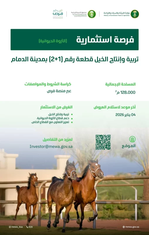 وأوضحت الوزارة أن الفرصة تتضمن مشروعًا لتربية وإنتاج الخيل في قطعة رقم (1+2) بمدينة الدمام، على مساحة إجمالية تبلغ 128,000 متر مربع، منوهة إلى أن آخر موعد للتقديم على هذه الفرصة 4 يناير 2026م.