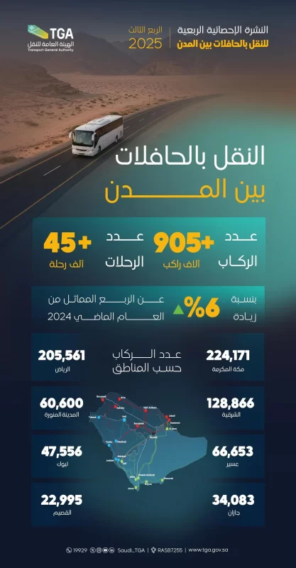 ووفقًا للنشرة الإحصائية المنشورة، حقق قطاع النقل بالحافلات بين مدن المملكة أرقامًا لافتة من حيث عدد الركاب خلال هذه الفترة، حيث بلغوا أكثر من 905 آلاف راكب.