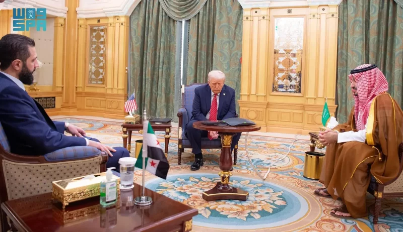 وفي 14 مايو 2025، جاءت محطة سياسية مهمة تمثَّلت في اللقاء المشترك الذي ضم سمو ولي العهد، والرئيس ترمب، والرئيس التركي رجب طيب أردوغان -عبر الاتصال الهاتفي-، والرئيس السوري أحمد الشرع؛ لبحث مستقبل الأوضاع في سوريا، وقد تناول اللقاء سبل دعم الاستقرار، وآليات تعزيز الأمن، وتهيئة البيئة الملائمة لإعادة الإعمار، في خطوة تؤكد الدور السعودي في تقريب وجهات النظر الإقليمية والدولية المتعلقة بالقضية السورية.