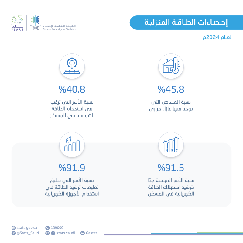 أعلنت الهيئة العامة للإحصاء نتائج إحصاءات الطاقة المنزلية لعام 2024، موضحة أن إجمالي استهلاك الكهرباء في القطاع السكني على مستوى المملكة بلغ 161,207 جيجاواط ساعة، في حين وصلت نسبة السكان الذين يحصلون على خدمات الكهرباء إلى 100%.