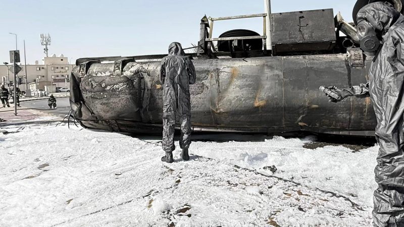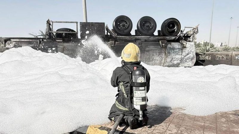 أخمد الدفاع المدني في الرياض، اليوم الجمعة، حريقًا في ناقلة وقود و3 مركبات إثر حادث مروري وقع على طريق الدائري الغربي.