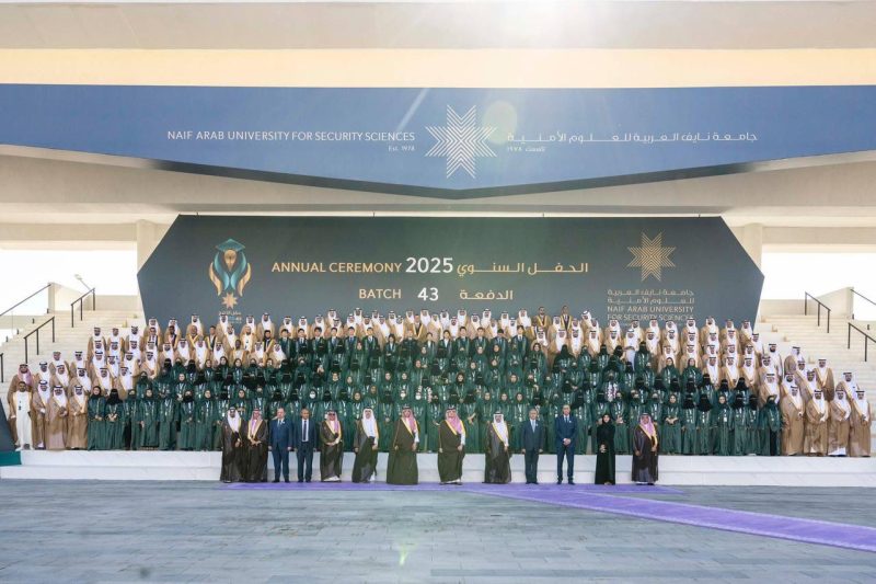 رعى صاحب السمو الملكي الأمير عبدالعزيز بن سعود بن نايف بن عبدالعزيز وزير الداخلية رئيس المجلس الأعلى لجامعة نايف العربية للعلوم الأمنية، اليوم، الحفل السنوي للجامعة، وتخريج (374) طالبًا وطالبة من (11) دولة عربية من الدفعة (43)، وذلك بمقر الجامعة في مدينة الرياض.