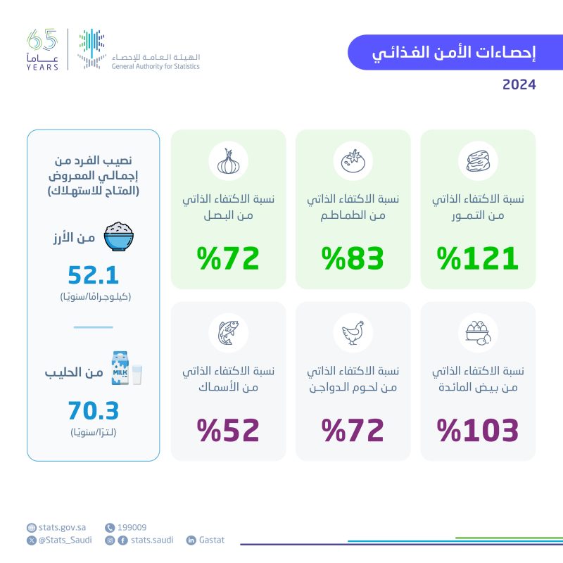 أظهرت بيانات الهيئة العامة للإحصاء أن المملكة حققت خلال عام 2024 مستويات اكتفاء ذاتي تجاوزت حاجز 100% في عدد من المنتجات الغذائية.