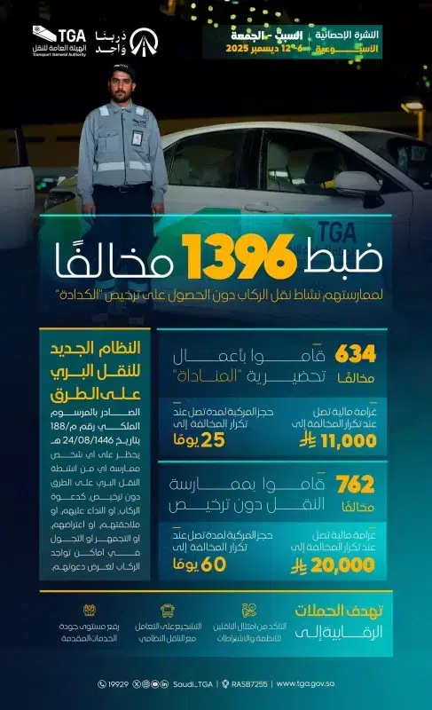 واصلت الفرق الرقابية في الهيئة العامة للنقل جولاتها التفتيشية، إذ ضبطت خلال الفترة من 6 – 12 ديسمبر الجاري، (1396) مخالفًا، أوقعت بحقهم الإجراءات النظامية التي تتضمن حجز المركبات وغرامات مالية؛ لممارستهم نشاط نقل الركاب دون الحصول على ترخيص “الكدادة”، وذلك في مختلف مناطق المملكة، بالتعاون مع عدد من الجهات المعنية.