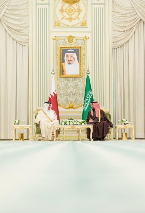 عقد صاحب السمو الملكي الأمير محمد بن سلمان، ولي العهد رئيس مجلس الوزراء، وسمو أمير دولة قطر الشيخ تميم بن حمد جلسة مباحثات في قصر اليمامة بالرياض.