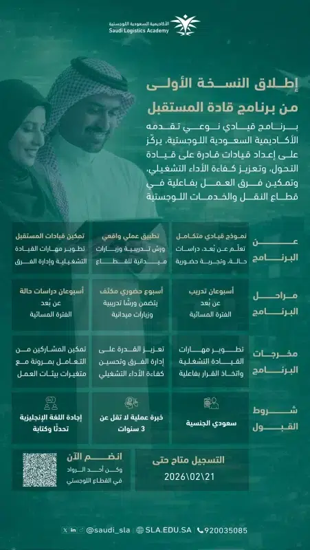 أعلنت الأكاديمية السعودية اللوجستية، إطلاق النسخة الأولى من برنامج قادة المستقبل، وهو برنامج قيادي نوعي يُنفذ لأول مرة، ويستهدف تأهيل قادة المستقبل في قطاع النقل والخدمات اللوجستية، ضمن جهود الأكاديمية في بناء قيادات مؤهلة قادرة على قيادة التحول والتطوير في القطاع.