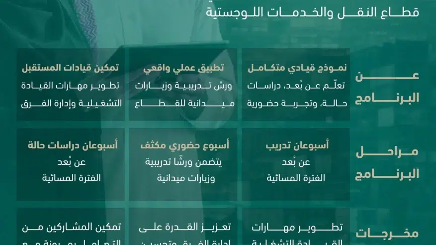 ويستهدف البرنامج القيادات والكوادر الوطنية العاملة في مجالات النقل، وسلاسل الإمداد، والخدمات اللوجستية، والعمليات والتشغيل، وفق معايير القبول المعتمدة.