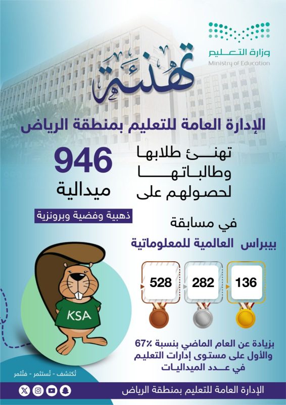 حققت الإدارة العامة للتعليم بمنطقة الرياض المركز الأول على مستوى إدارات التعليم في المملكة في عدد الميداليات، وذلك بعد فوز طلابها وطالباتها بـ 946 ميدالية ذهبية وفضية وبرونزية في مسابقة بيبراس العالمية للمعلوماتية.