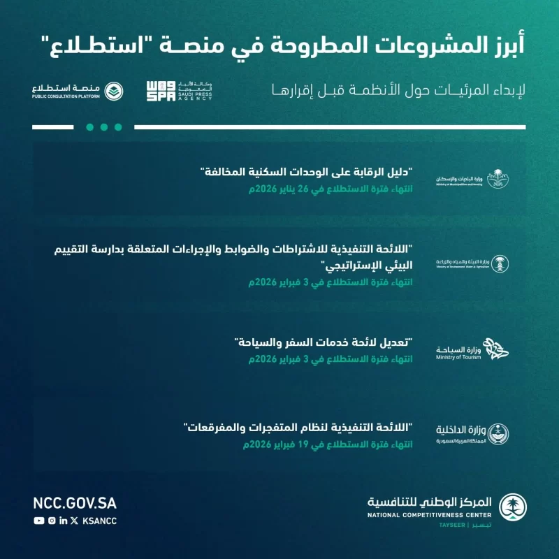 وتضمنت المشروعات المطروحة عبر المنصة، مشروع (دليل الرقابة على الوحدات السكنية المخالفة)؛ وتهدف من خلاله وزارة البلديات والإسكان إلى التعريف بظاهرة التقسيم المخالف للوحدات السكنية والمتطلبات والإجراءات اللازمة لمعالجة هذه المخالفات، وينتهي الاستطلاع على المشروع بتاريخ 26 يناير 2026م.
