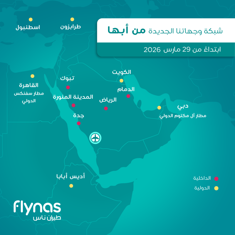واعتباراً من 29 مارس المقبل ، سيطلق طيران ناس المرحلة الأولى من رحلاته المباشرة من أبها إلى إحدى عشرة وجهة دولية وداخلية، منها ست وجهات دولية لكل من دبي والقاهرة واسطنبول وأديس أبابا، كوجهات دائمة إضافة إلى الكويت وطرابزون كوجهات موسمية، لتضاف إلى الوجهات الداخلية الخمس والقائمة حالياً من مطار أبها إلى الرياض والدمام وجدة والمدينة المنورة وتبوك، في حين سيتضاعف عدد الوجهات الدولية والداخلية المرتبطة بأبها بشكل تدريجي.