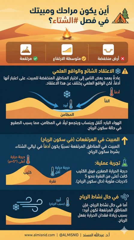 وأضاف المسند أن هذا الوضع ينعكس عند نشاط الرياح؛ إذ تصبح المناطق المرتفعة غالبًا أبرد من المنخفضات بسبب زيادة فقدان الحرارة بفعل الرياح، مؤكدًا أن اختيار موقع المبيت يجب أن يراعي حالة الرياح إضافة إلى الارتفاع عن سطح الأرض.