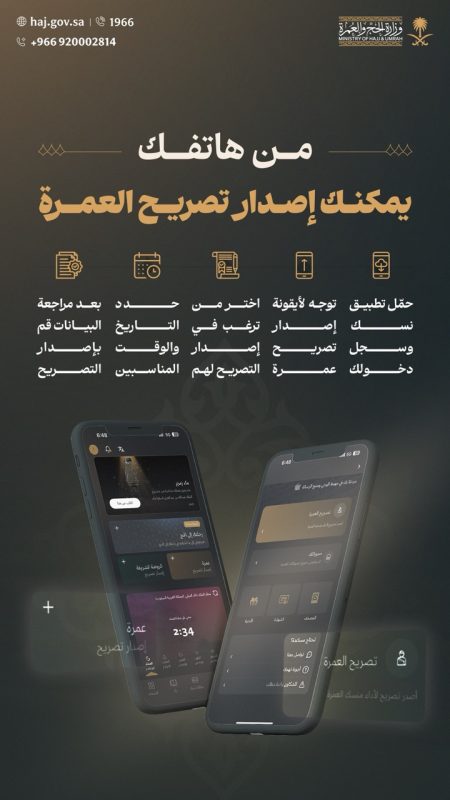 أكدت وزارة الحج والعمرة أنه يمكن للراغبين في أداء مناسك العمرة المبادرة بإصدار التصريح اللازم إلكترونيًا، بخطوات ميسرة وسريعة عبر الهواتف الذكية.