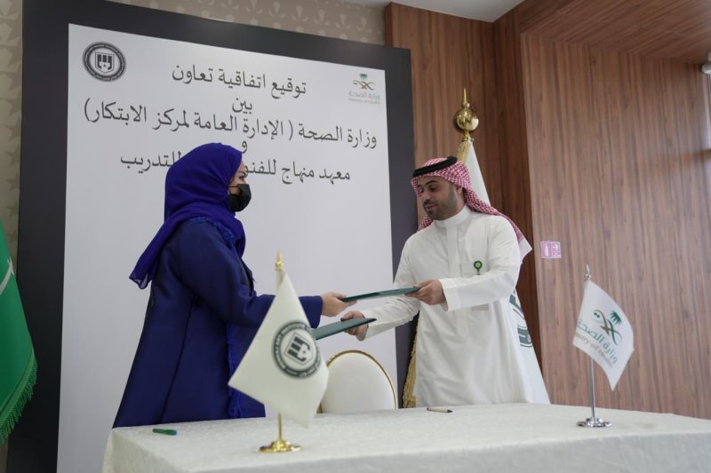 ومثل وزارة الصحة في توقيع الاتفاقية إبراهيم عسيري، نائب مدير مركز الابتكار بوزارة الصحة، بينما مثل المعهد هيفاء بنت منصور الجبيله، المدير العام لمعهد منهاج للفنون العالي للتدريب.