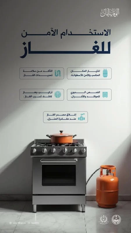 أوضحت المديرية العامة للدفاع المدني، أهمية الالتزام بإجراءات السلامة عند تسرّب الغاز، وعدم استخدام مفاتيح الكهرباء أو أي مصدر يسبب الاشتعال، وإخلاء المكان، وإحكام إغلاق صمام الغاز وتهوية الموقع بفتح النوافذ والأبواب ببطء، وتركيب أجهزة كشف تسرب الغاز في المنازل لحماية الأرواح والممتلكات.