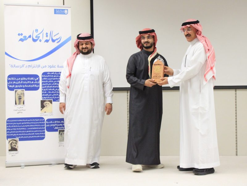 من جانبه، قدّم المشرف على صحيفة رسالة الجامعة، الدكتور محمد بن إبراهيم المستادي، شكره وتقديره لسعادة العميد على رعايته وحضوره، مؤكدًا أن الصحيفة مثّلت على مدى مسيرتها منصة تدريبية رائدة وبيئة ثرية لصناعة التجارب الجامعية المؤثرة، مبينًا أن الطلبة يشكّلون محور رسالة الصحيفة وغايتها الأساسية.