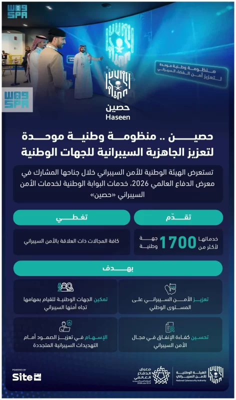 وتستعرض بوابة “حصين” خلال معرض الدفاع العالمي 2026، الخدمات السيبرانية المتقدمة التي تتيحها لأكثر من 1700 جهة وطنية؛ لتمكينها من رفع مستوى الجاهزية وتعزيز أمنها السيبراني عبر منظومة موحدة تمكّنها من الحصول على الخدمات المؤتمتة والتدابير والإجراءات الاستباقية حيال التهديدات السيبرانية المتجددة، وتعزيز جاهزيتها تجاه المخاطر السيبرانية، بما يسهم في ضمان تعزيز الأمن السيبراني على المستوى الوطني بوصفه هدفًا ومقومًا أساسيًّا لحماية المصالح الحيوية للمملكة.