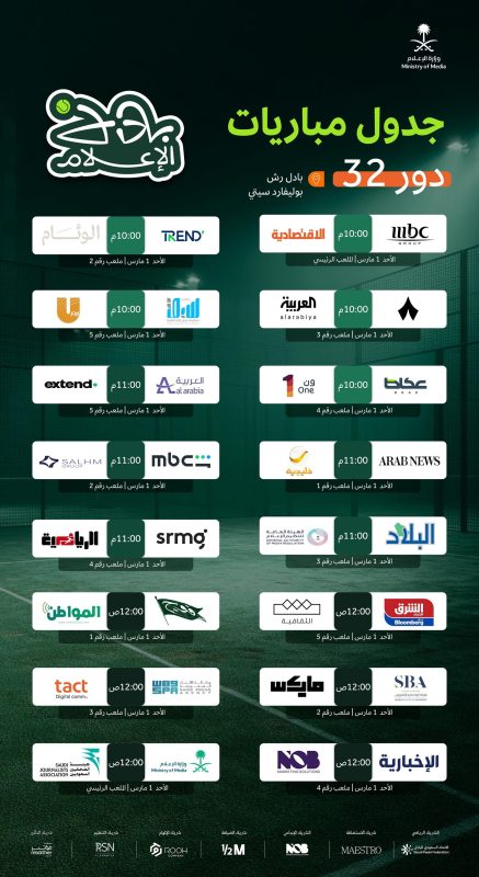 برعاية معالي وزير الإعلام الأستاذ سلمان بن يوسف الدوسري، تنظّم وزارة الإعلام بطولة الإعلام الرمضانية في نسختها الأولى “بادل الإعلام”، وذلك خلال الفترة من 1 – 5 مارس الجاري في ملعب “بادل رش” بمنطقة “بوليفارد رياض سيتي”، وبمشاركة عددٍ من المؤسسات الإعلامية، في إطار تعزيز التواصل بين الإعلاميين، ونشر ثقافة الرياضة وترسيخها أسلوب حياة.