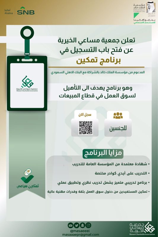 أعلنت جمعية مساعي الخيرية عن فتح باب التسجيل والاستقطاب في برنامج “تمكين”، وذلك بدعم من مؤسسة الملك خالد بالشراكة مع البنك الأهلي السعودي، في إطار جهودها المستمرة لتمكين الأفراد وتعزيز فرصهم في سوق العمل.