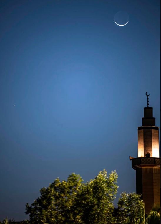ورُصد الهلال في الأفق الغربي عقب غروب الشمس، مترافقًا مع كوكب الزهرة الذي ظهر لامعًا بوضوح إلى جانبه، في لوحة سماوية آسرة تُعرف فلكيًا بظاهرة “الاقتران”، حيث يبدو جرمان سماويان متقاربين ظاهريًا في السماء.