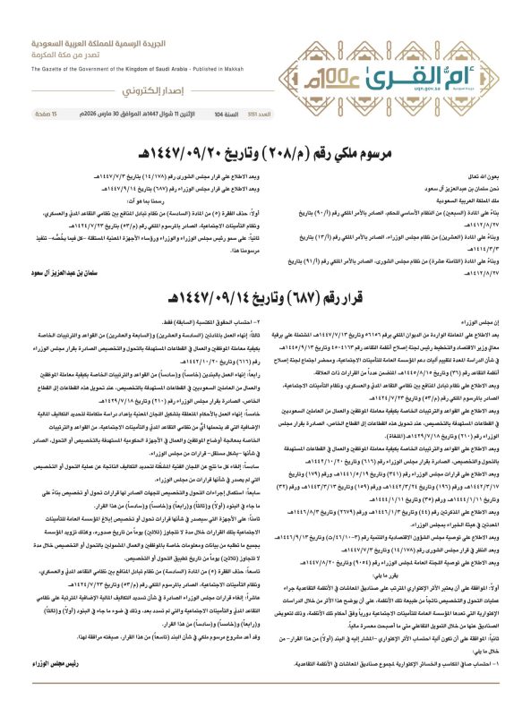 كما تضمن العدد قرار مجلس الوزراء بالموافقة على إنهاء العمل بمادتين من القواعد والترتيبات الخاصة بكيفية معاملة الموظفين والعمال في القطاعات المستهدفة بالتحول والتخصيص، ضمن مسار تطوير السياسات المرتبطة بإعادة هيكلة القطاعات.