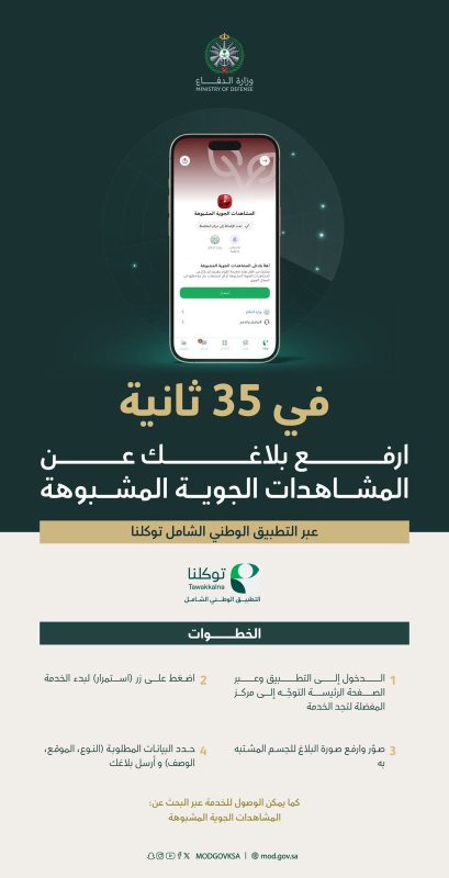 أعلنت وزارة الدفاع عن إتاحة خدمة إلكترونية جديدة تُمكّن المستخدمين من الإبلاغ السريع عن أي مشاهدات جوية مشبوهة، وذلك بالتعاون مع التطبيق الوطني الشامل “توكلنا”. وتتميز الخدمة الجديدة بالسرعة والسهولة، حيث يمكن إتمام عملية الإبلاغ بالكامل في غضون 35 ثانية فقط.