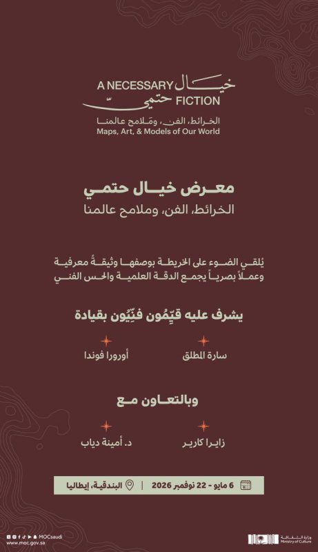 تستعد وزارة الثقافة لتنظيم معرض فنيّ عن الخرائط تحت عنوان: “خيالٌ حتميٌّ: الخرائط، الفن، وملامح عالمنا”، خلال الفترة من 6 مايو إلى 22 نوفمبر 2026م في مبنى “الأبازيا” -أحد المباني التاريخية بمدينة البندقية الإيطالية-، ويُشرف على تنظيم المعرض قيِّمُون فنِّيُّون بقيادة سارة المطلق وأورورا فوندا، وبالتعاون مع القيِّميين الفنِّيِّين المساعدِين زايرا كارير والدكتورة أمينة دياب، وذلك في إطار جهود الوزارة بتعزيز التبادل الثقافي الدولي مع مختلف دول العالم.