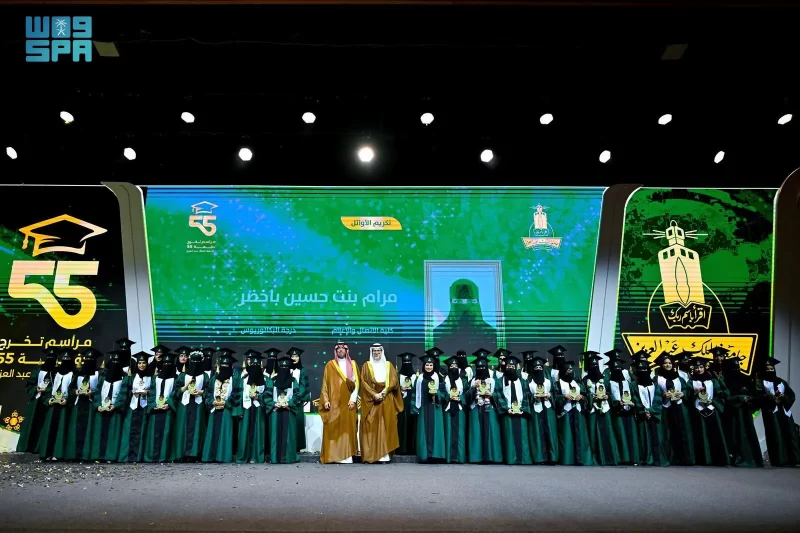 تحت رعاية صاحب السمو الملكي الأمير خالد بن فيصل بن عبدالعزيز مستشار خادم الحرمين الشريفين أمير منطقة مكة المكرمة، ونيابةً عن صاحب السمو الملكي الأمير سعود بن مشعل بن عبدالعزيز نائب أمير منطقة مكة المكرمة، شهد صاحب السمو الأمير سعود بن عبدالله بن جلوي مُحافظ جدة اليوم، حفل تخريج الدفعة الـ 55 من طلاب وطالبات جامعة الملك عبدالعزيز، والبالغ عددهم (24.039) طالبًا وطالبة في مختلف التخصصات، وذلك بمركز الملك فيصل للمؤتمرات، بحضور رئيس جامعة الملك عبدالعزيز الدكتور طريف بن يوسف الأعمى، وعدد من القيادات الأكاديمية وعمداء الكليات وأولياء أمور الخريجين والخريجات.