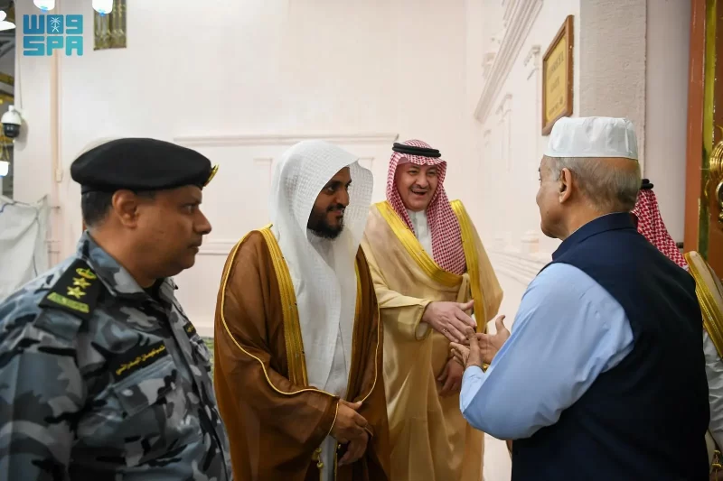 وكان في استقباله لدى وصوله المسجد النبوي، قائد قوة أمن المسجد النبوي العقيد متعب بن نعيمان البدراني، ومدير مكتب المراسم الملكية بالمنطقة إبراهيم بن عبدالله برّي، وعدد من المسؤولين.